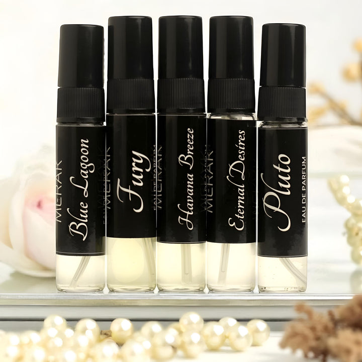 Step into a world of mystery, elegance, and power with our exclusive tester pack. Choose any 5 samples from this premium collection: